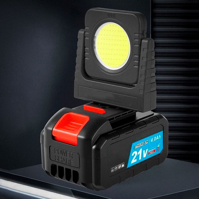Прожектор працює від акумуляторів 21V, що робить його повністю автономним і зручним для використання без доступу до електромережі. Швидке підключення акумулятора забезпечує стабільну роботу та дозволяє використовувати пристрій у будь-якому місці — вдома, в гаражі або на виїзді.